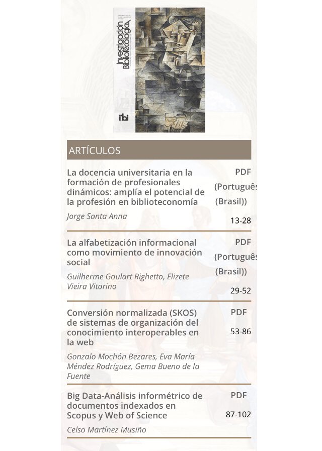 No ar nova edição da: Investigación Bibliotecológica|(Pra quem for prestar pra Prof da USP, esse artigo pode ajudar em mais de 1 ponto: “Conversão normalizada (SKOS) de sistemas de organização do conhecimento interoperáveis na la web” 😉) #RevistasCI Ver: https://t.co/o9oYteQmjZ pic.twitter.com/l5KKAUwROI