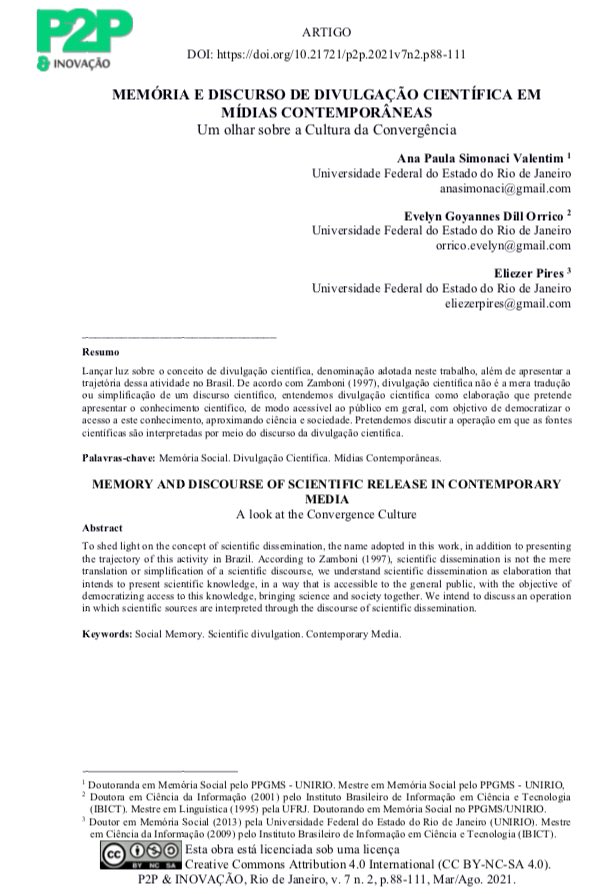 Memória e discurso de divulgação científica em mídias contemporâneas: um olhar sobre a #CulturaDaConvergência l “[…] #DivulgaçãoCientífica esteve, em geral, voltada à democratização do conhecimento e à aproximação entre a ciência e a população.[…]” https://t.co/YHxafu3OSL pic.twitter.com/MlNS9iMsVe