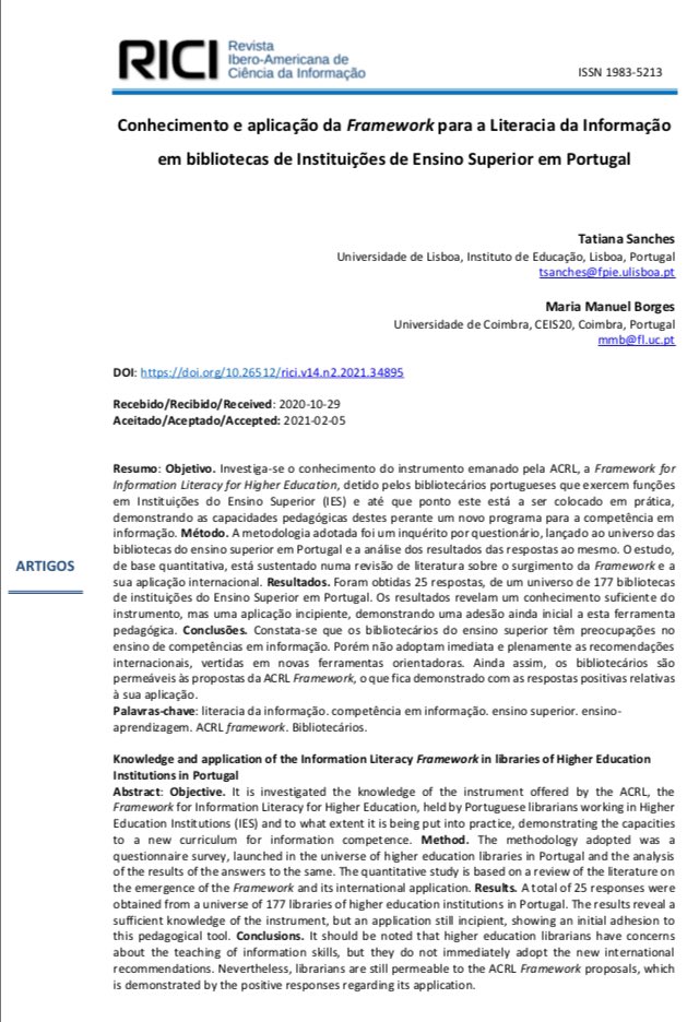 Conhecimento e aplicação da Framework para a Literacia da Informação em bibliotecas de Instituições de Ensino Superior em Portugal l #BibliotecasUniversitárias estão adotando o Framework For Information Literacy For Higher Education (ACRL, 2016)? #Coinfo https://t.co/3WkUmdD9RL pic.twitter.com/z1OKLhjqf5