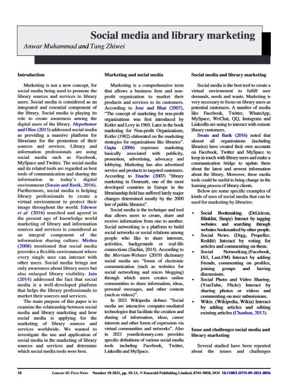 Social Media e Marketing em Bibliotecas l “Os profissionais da biblioteca devem estar envolvidos com a mídia social para entreter os usuários da biblioteca e tornar a imagem da biblioteca mais atraente para o mundo.” #MarketingEmBibliotecas doi.org/10.1108/LHTN-0… https://t.co/6MQtlWTiO8