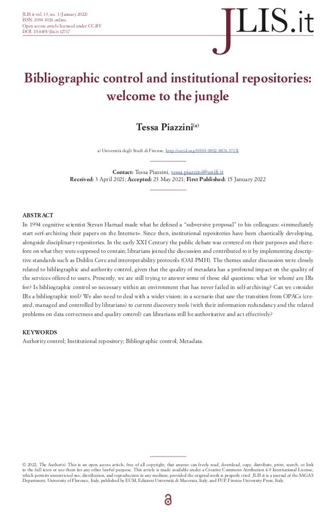 Controle bibliográfico e repositórios institucionais: bem-vindo à selva l “Em biblioteconomia falamos frequentemente de ‘ecossistemas’. Dentro dessa metáfora naturalista, eu costumava pensar nos #repositórios como uma selva: caótica, densa e impenetrável.” jlis.it/index.php/jlis… https://t.co/rWLtjXcg2K