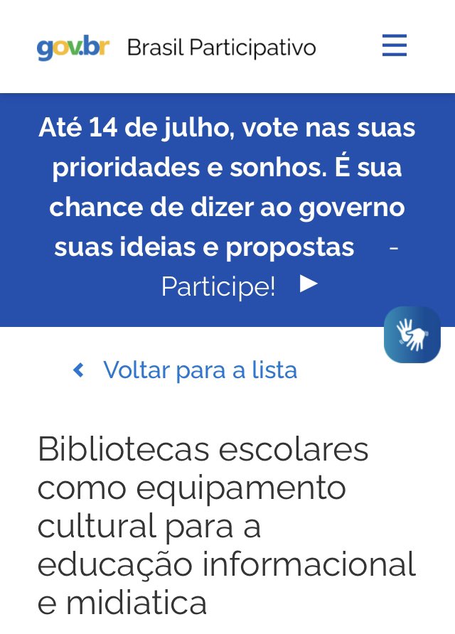 Bibliotecas escolares como equipamento cultural para a educação informacional e midiática l “Até 14 de julho, vote nas suas prioridades e sonhos. É sua chance de dizer ao governo suas ideias e propostas” #BibliotecasEscolares #Votação brasilparticipativo.presidencia.gov.br/processes/prog… pic.twitter.com/xilLgfRcNR